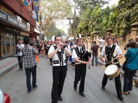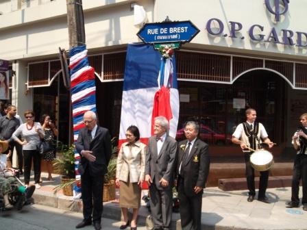 Accompagné par l’ancien Ambassadeur de France, maintenant à la retraire, Gildas Le Lidec, à l’origine de la demande de nouvelle dénomination, l’Ambassadeur a présidé une courte cérémonie aux couleurs bretonnes et françaises. Une animation bretonne avec des musiciens du bagad Kerlenn-Pondi de Brest et des «bretons» en costumes traditionnels (en fait des étudiants de l’Université de Rangsit).