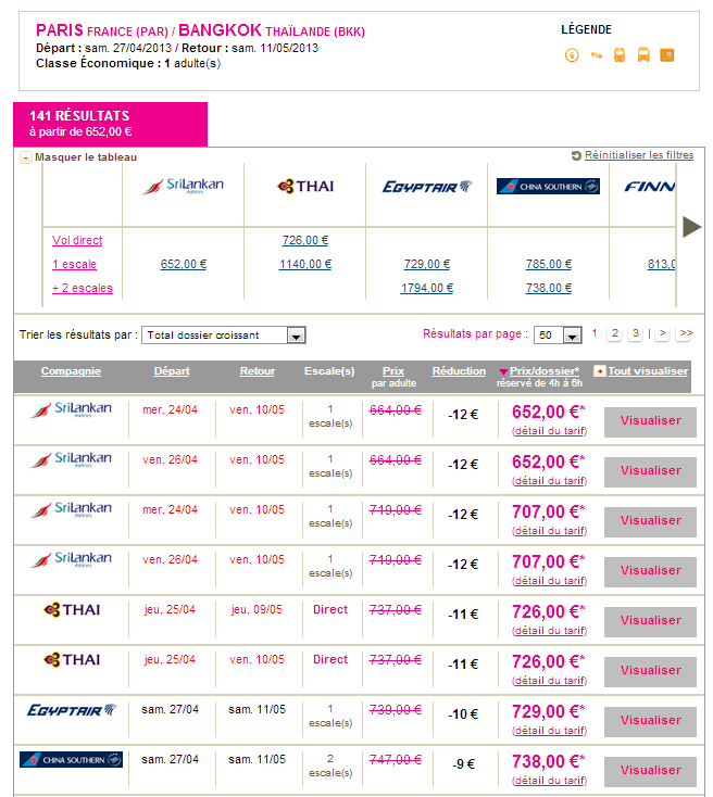 Cela tombe bien pour faire les simulations, nous sommes actuellement en période de vacances scolaires d’hiver en France, et en haute saison en Thaïlande. Regardons ce que l’on peut trouver avec le comparateur spécialiste des vols à la dernière minute.