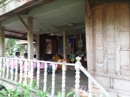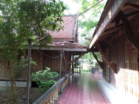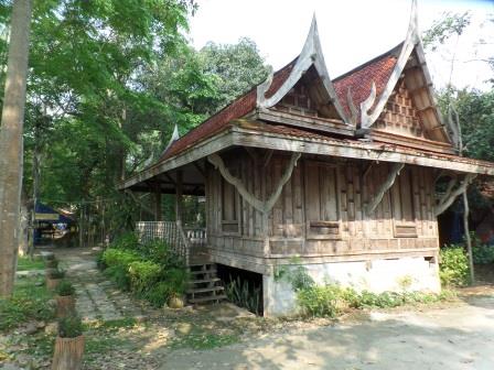 Pour y aller il faut suivre la plus grande route à la sortie de Chiang Khan pendant environ 2 kilomètres et ensuite tourner à gauche sur une petite route qui longe le Mékong. Sur cette petite route vous pouvez vous arrêter à un temple dans les arbres sur votre gauche. Le temple qui vient d’être reconstruit a remplacé un vieux temple en bois, qui, certes, avait besoin de restauration mais était plein de charme. Le nouveau temple est un bâtiment en béton sans intérêt mais à coté il y a 2 petits bâtiments en bois dont l’un abrite une statue réaliste grandeur nature d’un ancien abbé du monastère, et devant laquelle viennent se recueillir les thaïlandais.