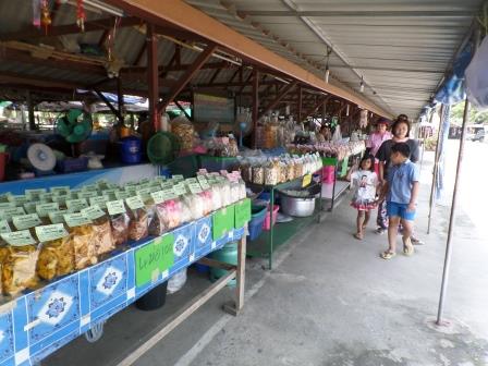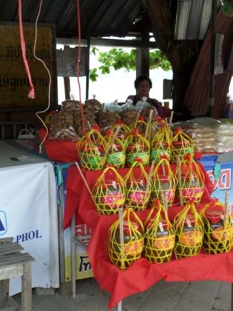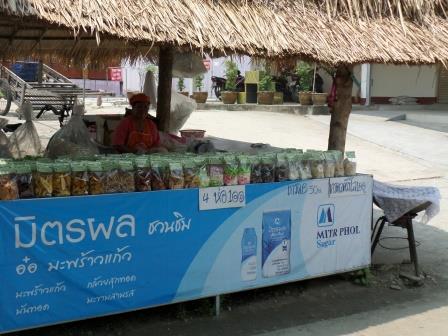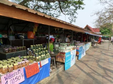 Retour au marché où vous pourrez acheter des T-shirts souvenirs de Kaeng Khud Khu, ainsi que des tissus typiques de l’Isan. Vous y trouverez également de l’alcool de riz dans des jarres en terre, mais aussi la spécialité locale : la noix de coco, sous toutes ses formes et de toutes les couleurs.