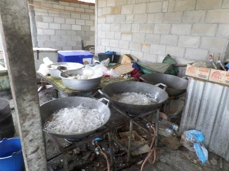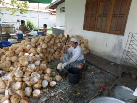 Après ces opérations, la noix de coco est prête pour la cuisson dans de grands woks mélangée avec du sucre pour la confire.