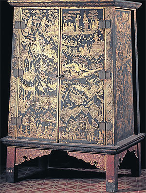 Un cabinet,19eme siecle, destiné à recevoir les manuscrits religieux, les peintures en laque decrivent des scènes des 10 vies antérieures de Bouddha