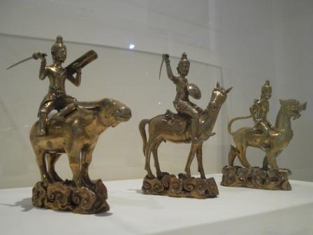 3 statues des dieux chevauchant un buffle, un cheval et un lion, période Rattanakosin, 19ème siècle