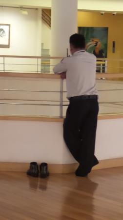 Visiblement la Queen’s Gallery n’atteint pas son objectif de faire venir de nouveaux visiteurs. Pour cette exposition nous n’étions que deux, ce qui permet aux gardiens d’être plus relax, sur la photo ci-dessous, le gardien a même enlevé ses chaussures pour être plus à l’aise!