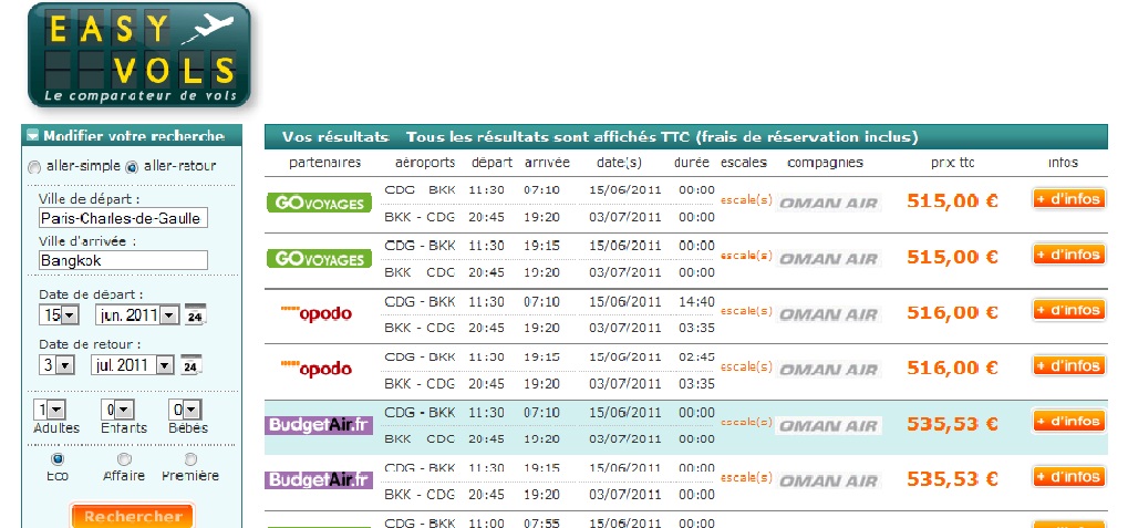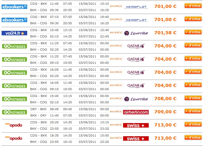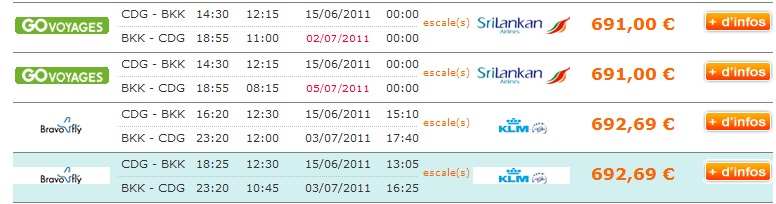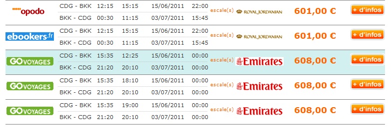 Le test réalisé avec le comparateur de vol pour un départ le 15 juin 2011 avec retour le 3 juillet 2011 donne les résultats suivants: