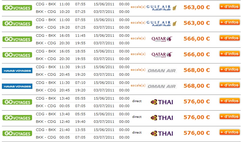 On obtient déjà un vol direct avec THAI AIRWAYS à 576€ soit 61€ de plus que le premier résultat… Et si on y pense bien, dépenser plus de 61€ lors d’une escale c’est extrêmement rapide!!! Et je ne parle pas de la perte de temps…