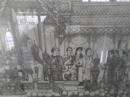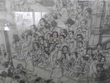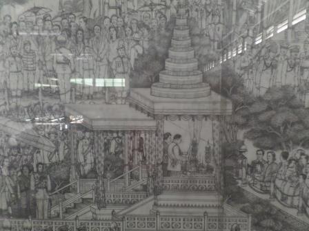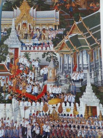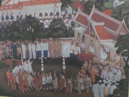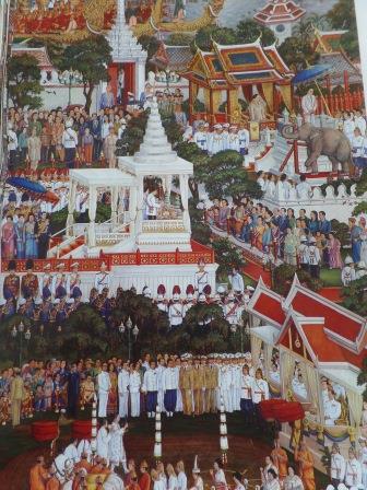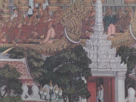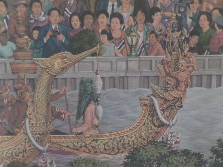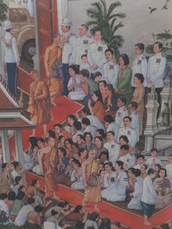 Les deux derniers panneaux consacrés au règne de Rama IX, le roi actuel, sont les plus foisonnants, ce ne sont plus trois mais quatre scènes différentes sur chacun des panneaux. Peut-être que s’agissant du règne actuel la mémoire est plus fraiche et le commanditaire est aussi celui qui est le thème des fresques.