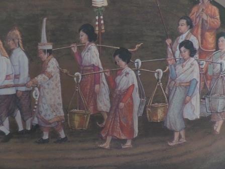 La partie inférieure de la fresque montre la cérémonie du labour royal. L’agriculture étant le pilier de l’économie thaïlandaise, le Roi a voulu que revive cette cérémonie qui symbolise l’abondance des récoltes. Le Roi et la Reine assistent au tracé du sillon et à l’ensemencement.