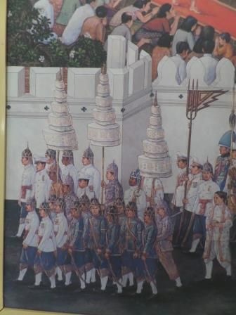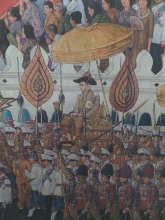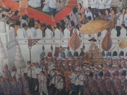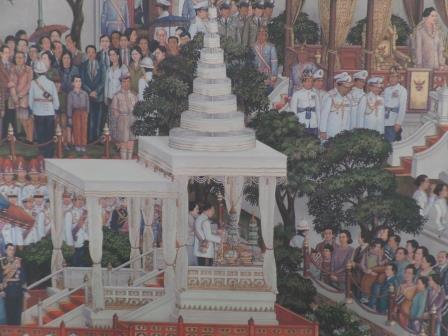 Dans la partie inferieure c’est la procession qui marque le 3eme cycle de vie du monarque en 1963, un cycle de vie représentant 12 ans. Cette procession partait du Grand Palais jusqu’au Wat Bowonniwet. Ce fut la seule fois durant ce règne que cette procession eu lieu.