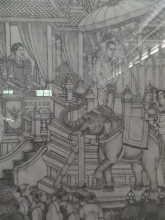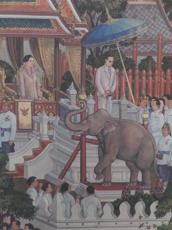 Egalement dans la partie centrale une deuxième scène dépeint la présentation au Roi de Phra Sawet Adulyadej Phahon, le premier éléphant blanc découvert pendant le règne de Rama IX en 1959. Le Roi avait une affection particulière pour cet éléphant qui dit-il à la mention de son nom élevait la trompe en signe de wai (salut marquant le respect).