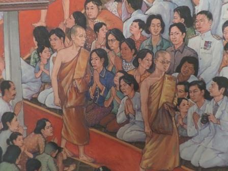 En 1956 le Roi fut ordonné moine, la cérémonie eu lieu au Temple du Bouddha d’Emeraude mais certains rites eurent lieu au Phra Buddha Ratana Sathan. Parmi les moines ordonnés le Roi est reconnaissable à ses lunettes.