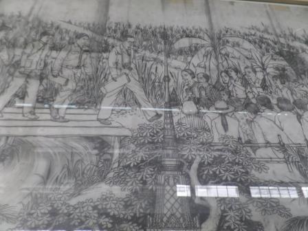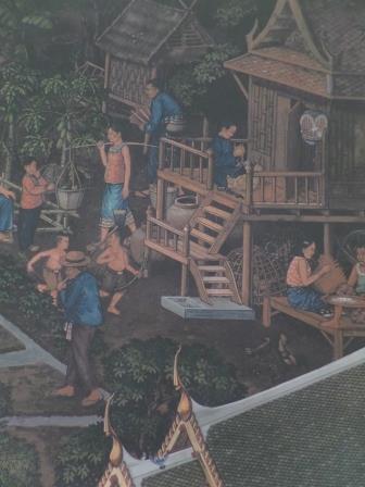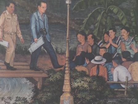 Enfin le haut de la fresque est consacré à un des chantiers menés par le Roi pendant son règne, l’autosuffisance alimentaire pour ainsi améliorer la qualité de vie des paysans. La scène montre le Roi lors d’une de ses fréquentes visites dans les villages, accompagne de la Princesse Sirindhorn, il porte en bandoulière son appareil photo, encore un des signes qui caractérise le Roi. On y voit également des scènes de vie villageoise.