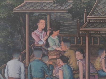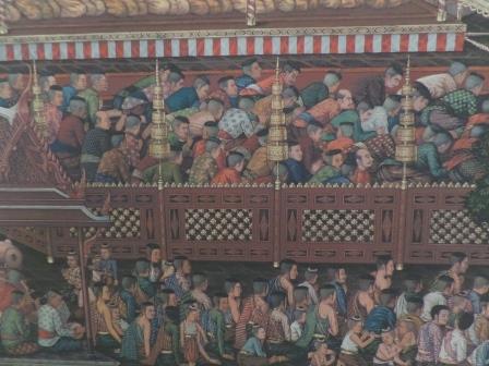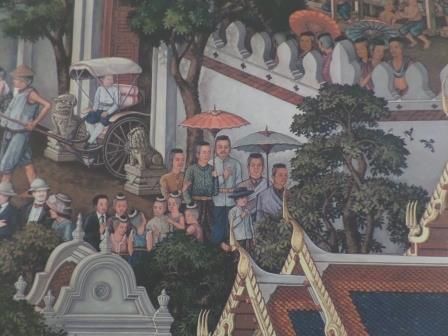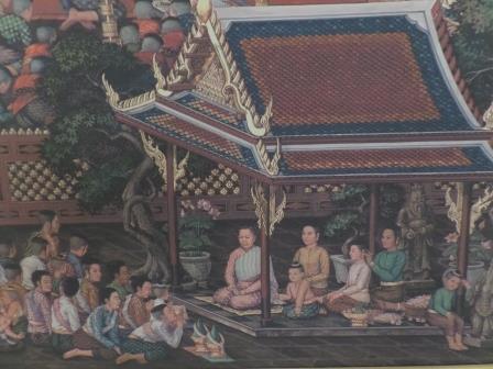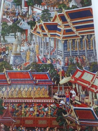 Une autre règle de la peinture thaïe est appliquée ici, comme dans les autres panneaux, la règle de la perspective dit « œil d’oiseau », c’est-à-dire en 2 dimensions, la profondeur n’est pas indiquée, ceci se remarque essentiellement quand est figuré un bâtiment.