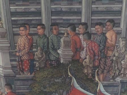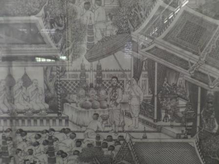 En 1873, le Roi Chulalongkorn, Rama V, éleva la Chapelle au rang de chapelle royale pour sa cérémonie d’ordination. Le panneau montre le Roi présidant cette cérémonie dans sa partie inférieure, son ordination dans la partie centrale et des scènes de la vie courante dans sa partie supérieure.