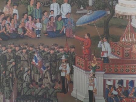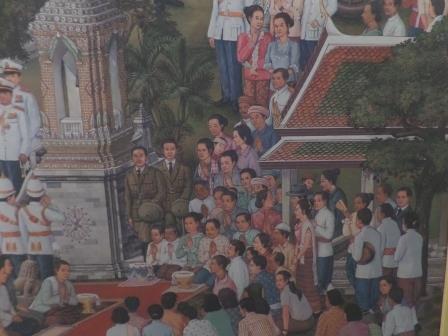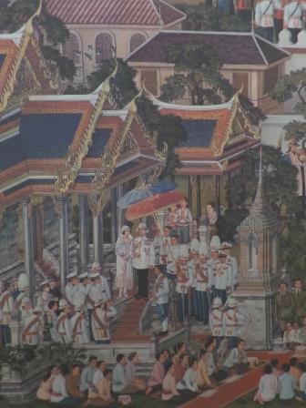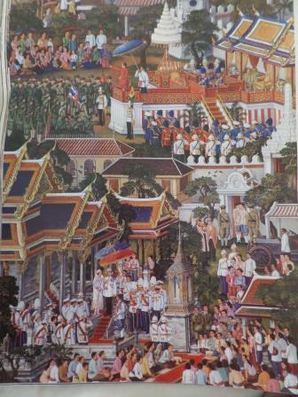 Lorsqu’en aout 1914, le Roi Vajiravudh épousa la Reine Suvadhana, les nouveaux mariés allèrent se recueillir à Phra Buddha Ratana Sathan. C’est la scène décrite dans le bas du tableau. La cérémonie est de style occidental, le Roi donne le bras a la Reine qui porte une robe de mariée occidentale, lui-même a quitté les habits traditionnels. Le public est aussi autorisé à voir le couple royal. Il prépare des pièces de tissu pour qu’elles soient foulées par le couple royal et des fleurs comme offrande.