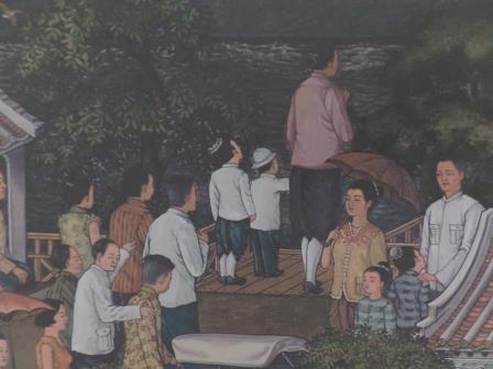 Les scènes du haut montrent la vie ordinaire : des enfants se baignant, à cette époque les filles et les garçons portaient les cheveux rassemblés sur le sommet du crâne en chignon. Les rickshaws étaient le moyen préféré de transport.