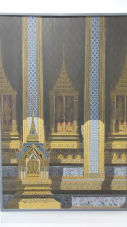 Ceci est particulièrement vrai pour les œuvres concernant des temples thaïlandais. Il est concentre sur la précision du détail, la lumière jouant sur les motifs décoratifs de verre du temple.