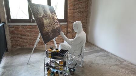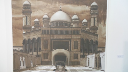 Enfin est exposée une série de tableaux préparatoires où l’artiste s’est représenté avec son chevalet devant l’édifice qu’il va peindre, c’est assez amusant, il représente également toujours sur ces tableaux un deuxième peintre portant un casque colonial, symbole de l’occidentalisation de l’art.