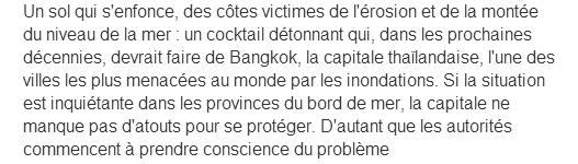 Le changement climatique menace 130 villes de part le monde telles que Amsterdam, Londres ou New York. Bangkok fait partie des villes les plus sensibles et doit se préparer à faire face au risque de submersion. La Capitale thaïlandaise subissant la dérive à l’extrême du climat tropical, doit rester vigilante quant au risque de phénomènes cycloniques de très haute énergie, ainsi que de ses conséquences telles que prédites par le célèbre Docteur Smith.