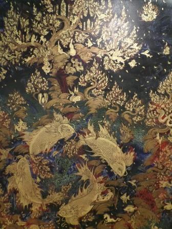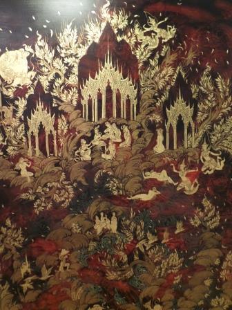 La technique utilisée est celle appelée en thaï «Laithong» qui est de la peinture laquée, recouverte de feuilles d’or et ensuite lavée. C’est une technique ancienne très utilisée pendant la période Ayutthaya et dont on trouve de nombreux exemples sur des cabinets de cette période et sur les vantaux des portes des temples ou les volets.