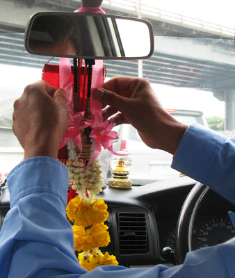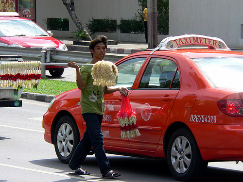Parmi les divers talismans, amulettes et autres porte bonheur que les chauffeurs de taxi peuvent utiliser dans leur voiture, il y a aussi des guirlandes de fleurs. Ces colliers de fleurs, souvent du jasmin sont vendus dans les rues. Ces vendeurs déambulent directement sur la chaussée!